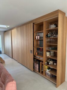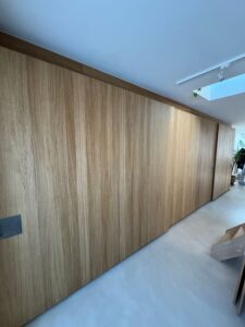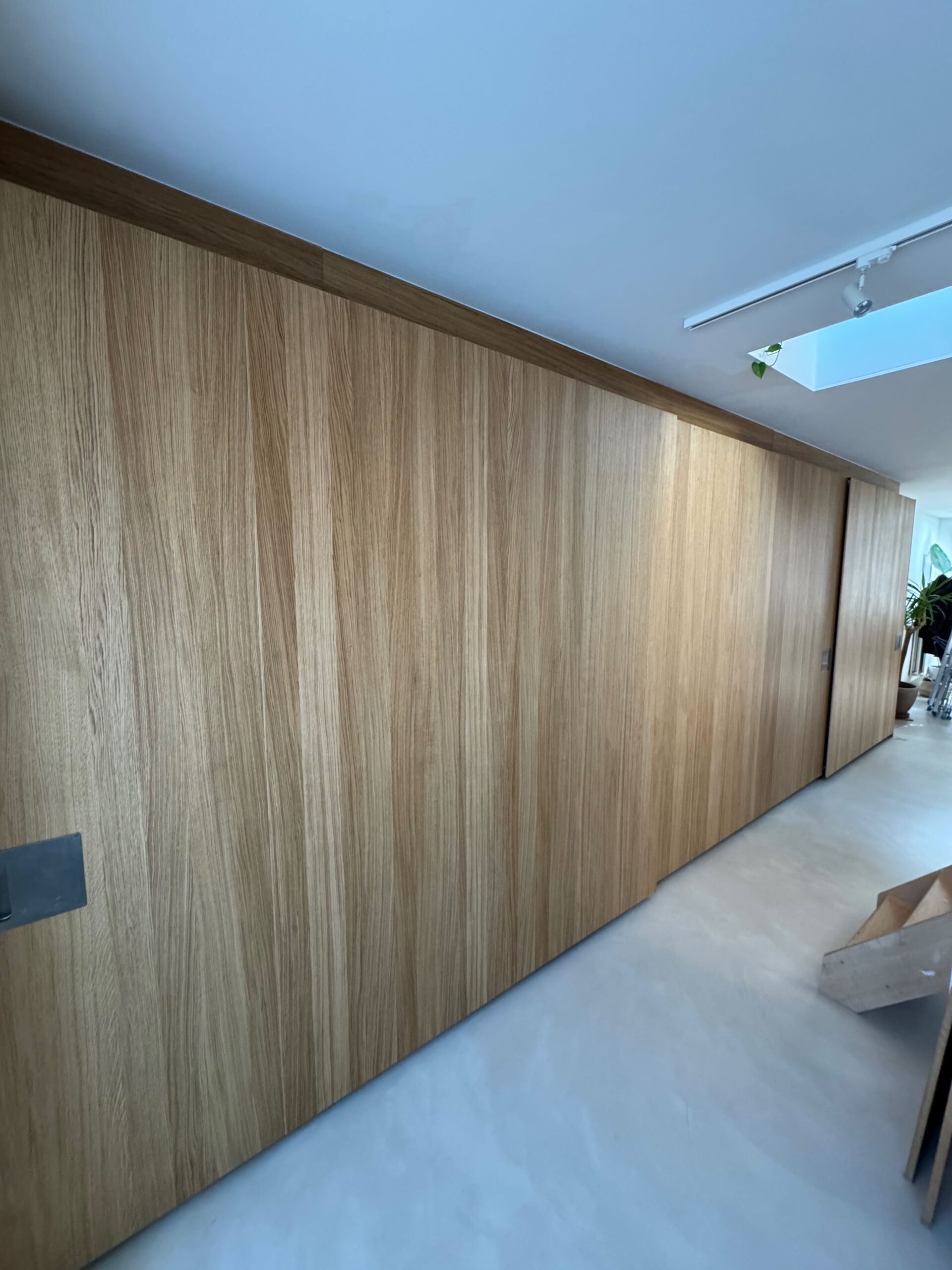 Deuren kastenwand uit MDF met eikfineer, afgewerkt met Rubio Monocoat “Pure”.